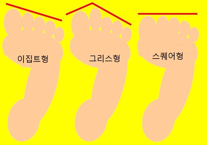 한국인에게 가장 많은 것으로 알려져 있는 타입의 발모양입니다.엄지 발가락 발가락이 신발에 닿기 쉬운 경향이 있기 때문에 발가락에 여유가 있는 것을 선택합니다.