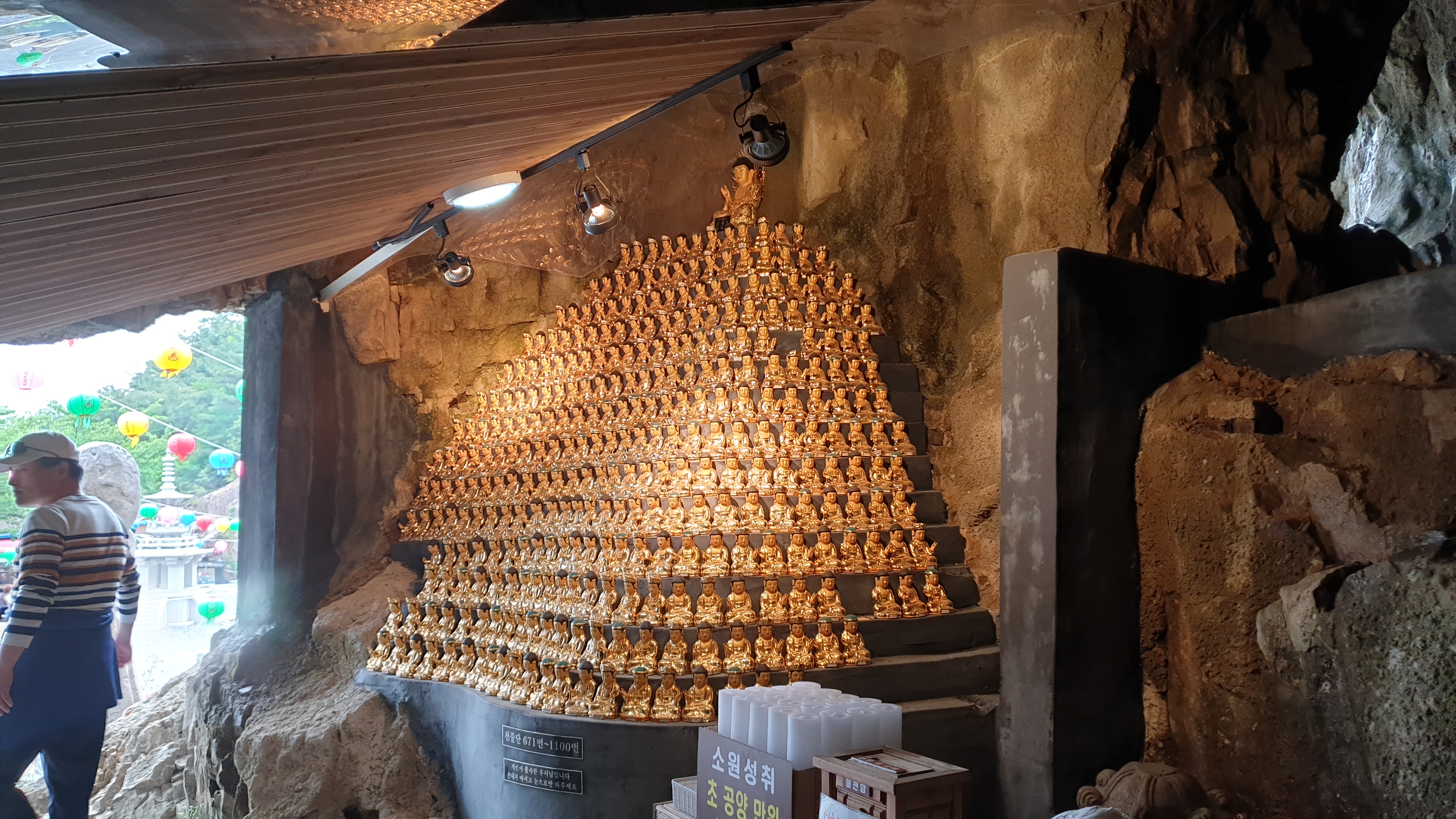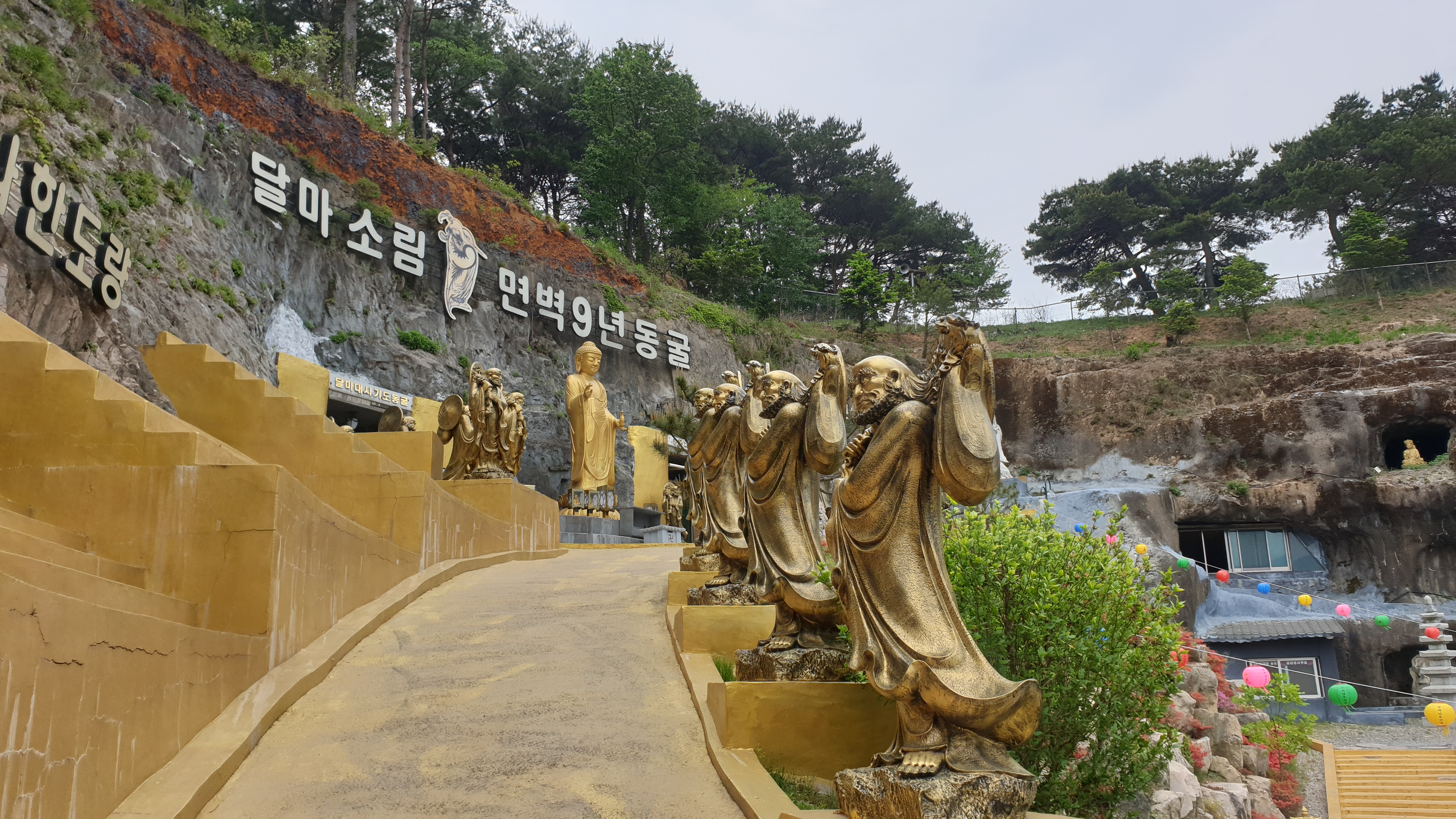 돌산위의 달마는 황금색 플라스틱 조형물로 시선이 등을지고 있는데 아...