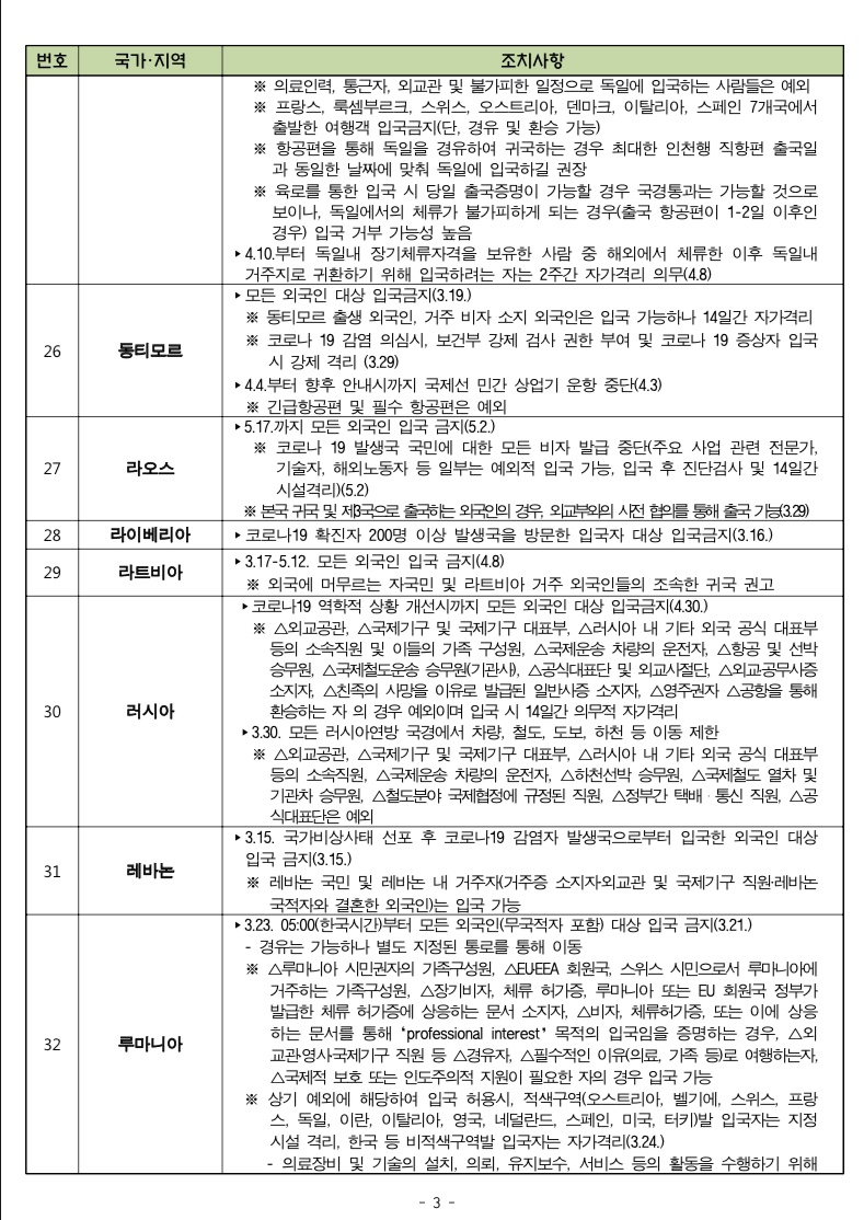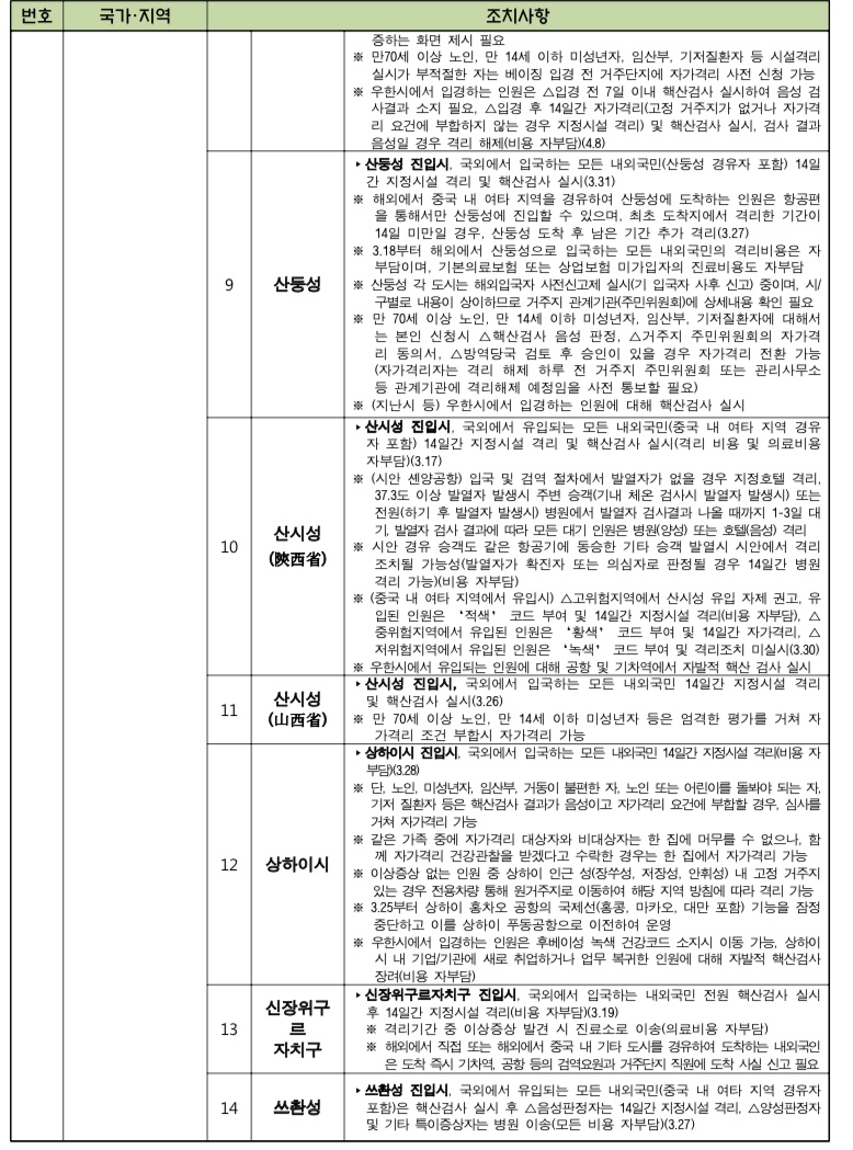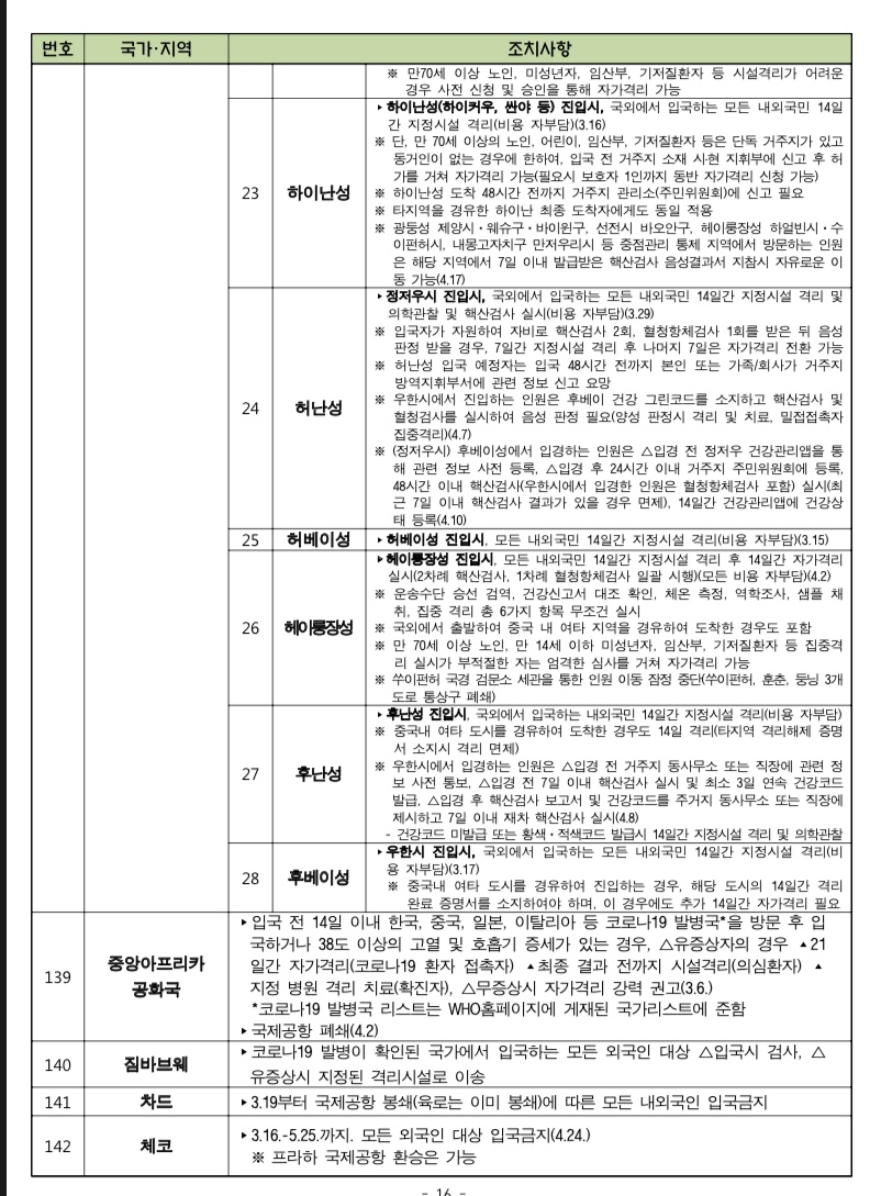 -(검역 강화)5.31까지 전세계발 모든 입국자(일본인 포함) 대상 검역소장이 지정하는 장소에서 14일간 대기 및 대중교통의 사용 자제 요청(4.27)