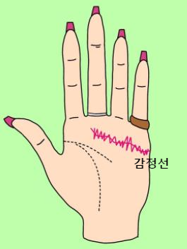 선이 굽이치고, 선으로부터 많은 미세한 주름이 나와 있거나 들어가 있거나, 선의 도중에 쇠사슬 상태가 되어 있거나 하는 등 「흐트러진 감정선」을 가지는 사람은, 희로애락이 격렬한 타입입니다.