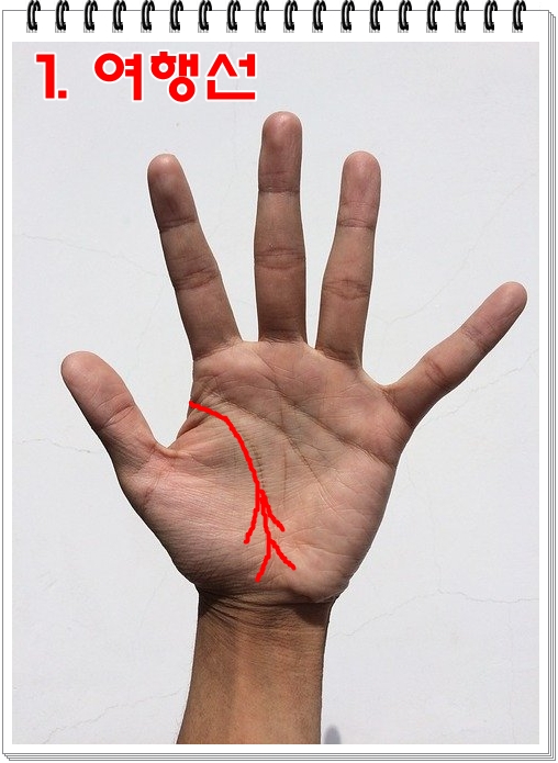 ①손목선 가운데를 향해 작게 나가는 여행선은 비교적 짧은 기간의 여행이나 단거리에서의 이동등을 나타냅니다.
