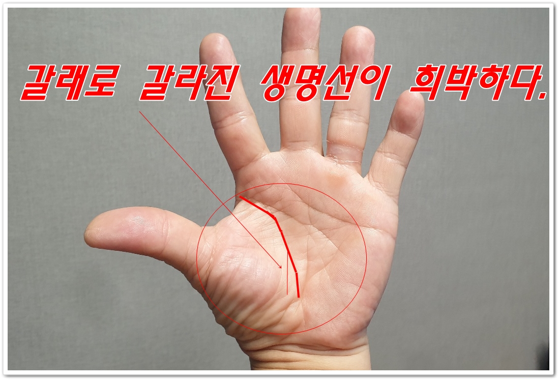 얇은 생명선이 갈라져 있는 경우, 후반생 또는 만년기에 상당히 생명력이 약해진다고 여겨집니다.