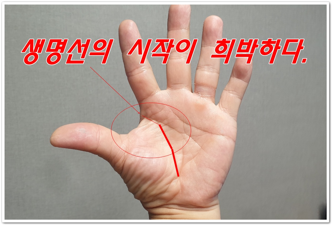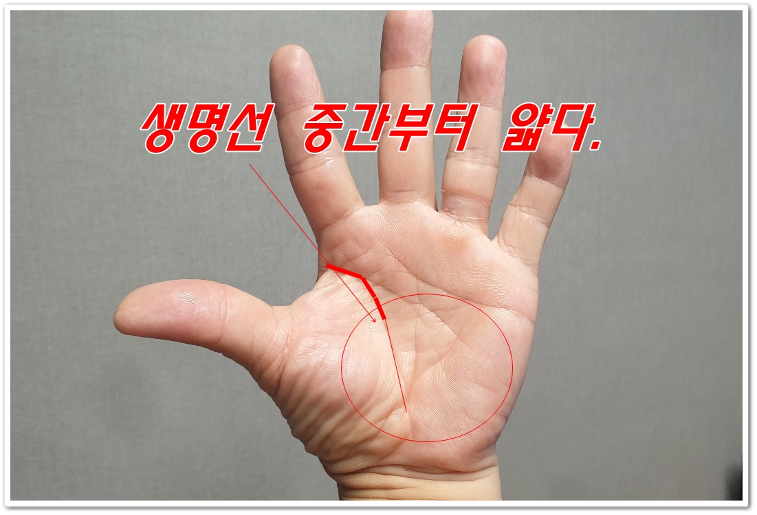 이 생명선이 얇으면 일찍 죽을 것 같아 싫은 분위기가 감돌지만,