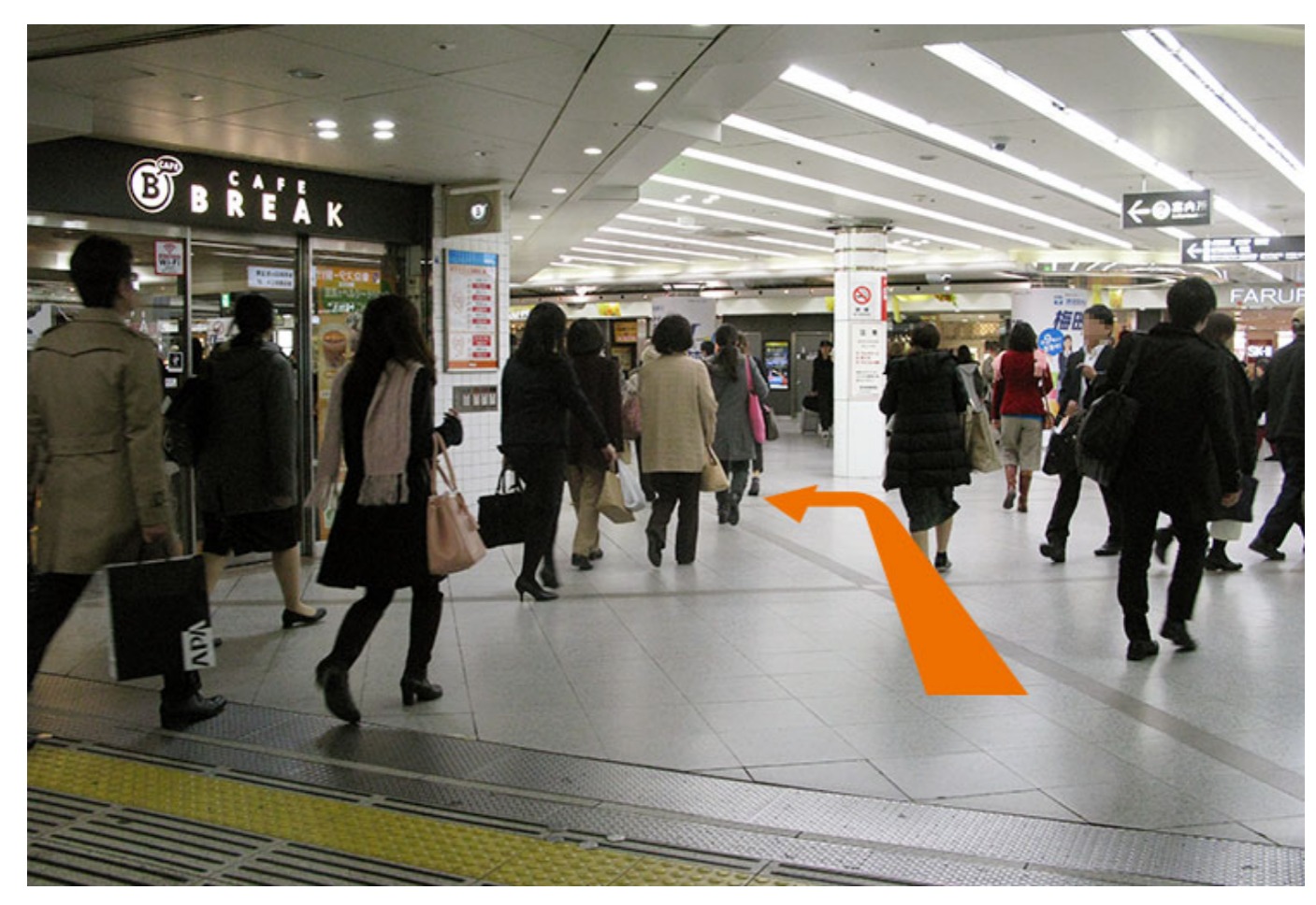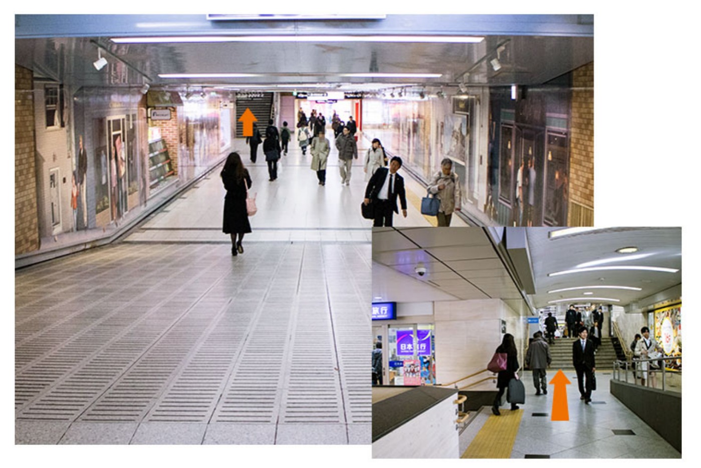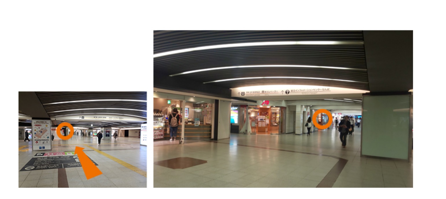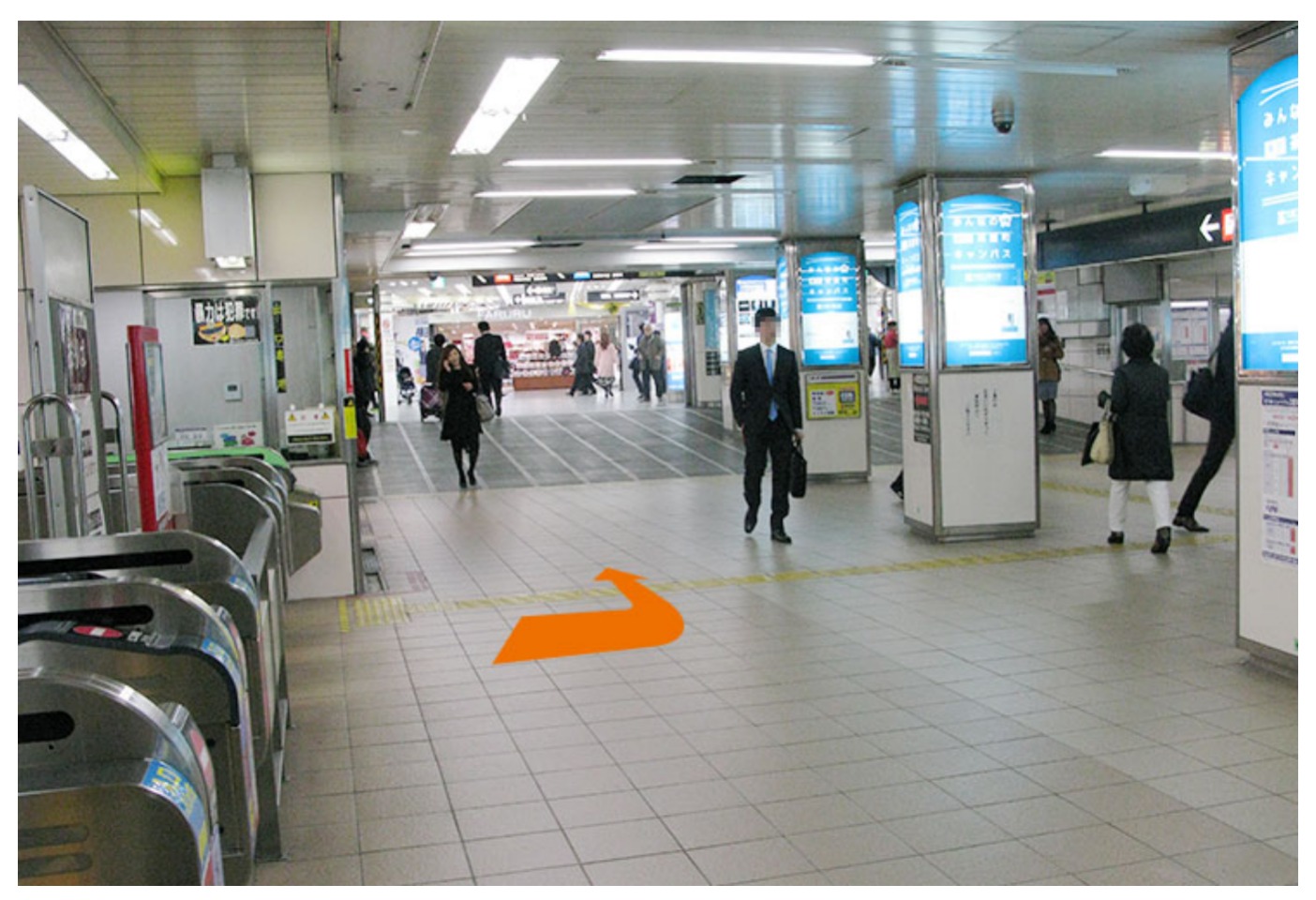 북쪽 개찰구를 나오면 우회전하여 직진하십시오 * 우회전하여 바로 앞의 계단을 내려 가지 마십시오. 계단 뒤쪽의 통로로 향하십시오.