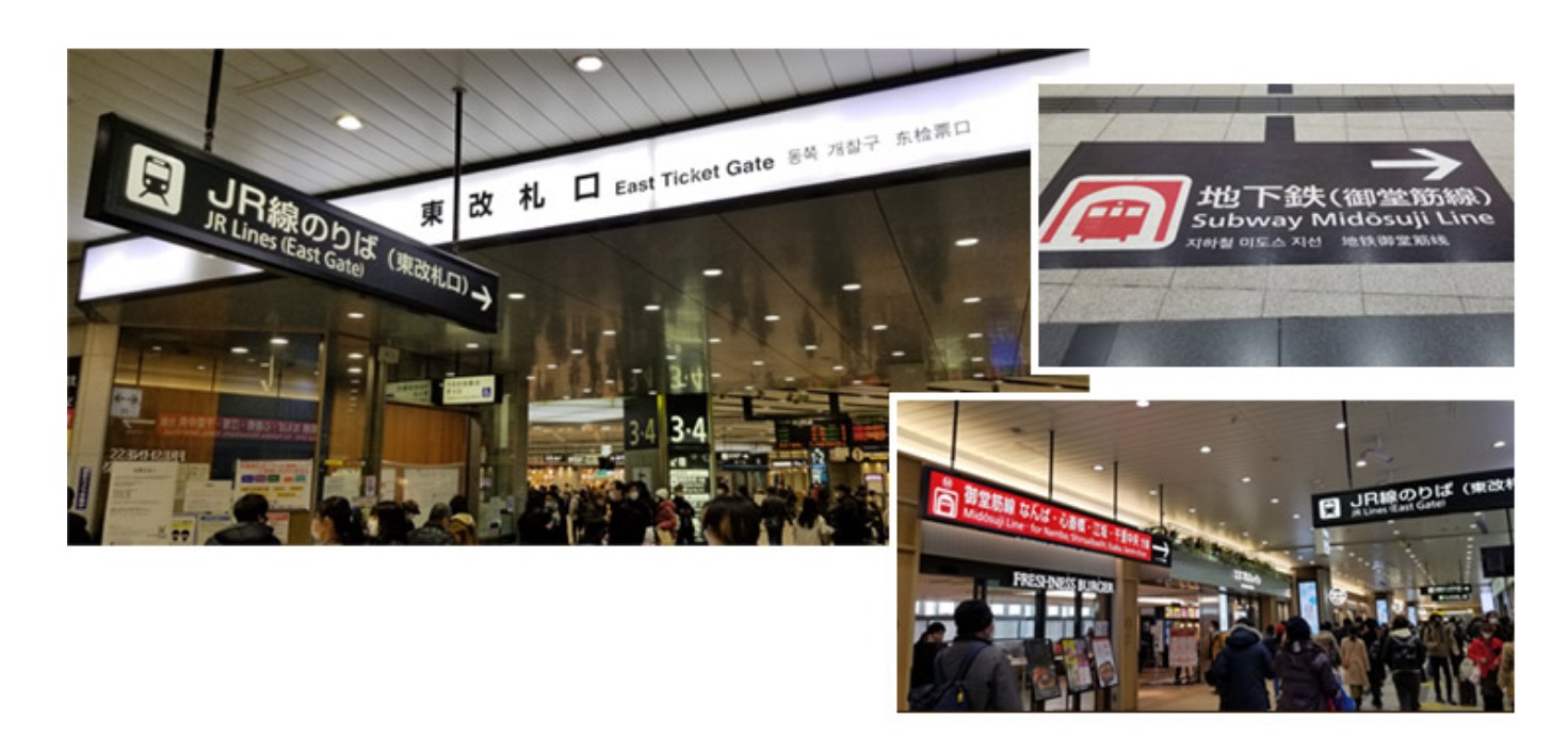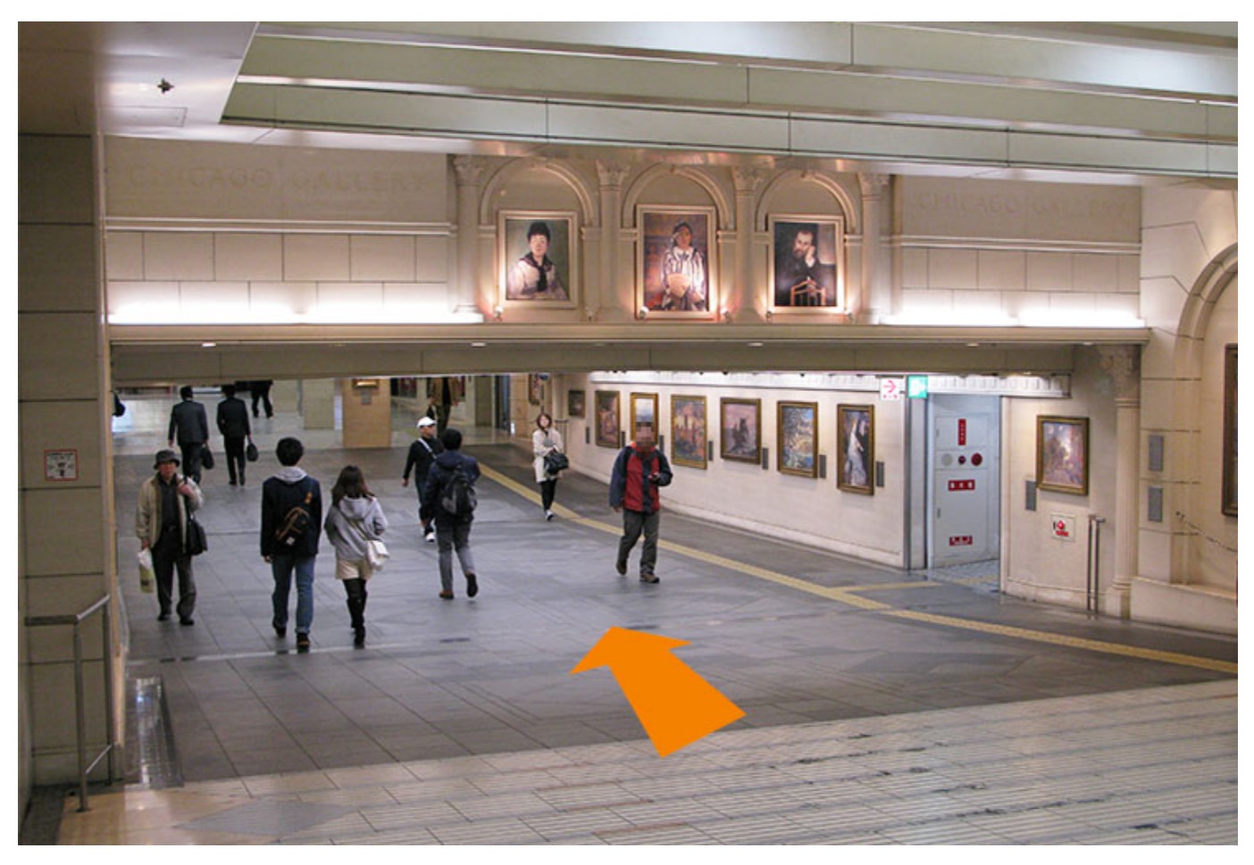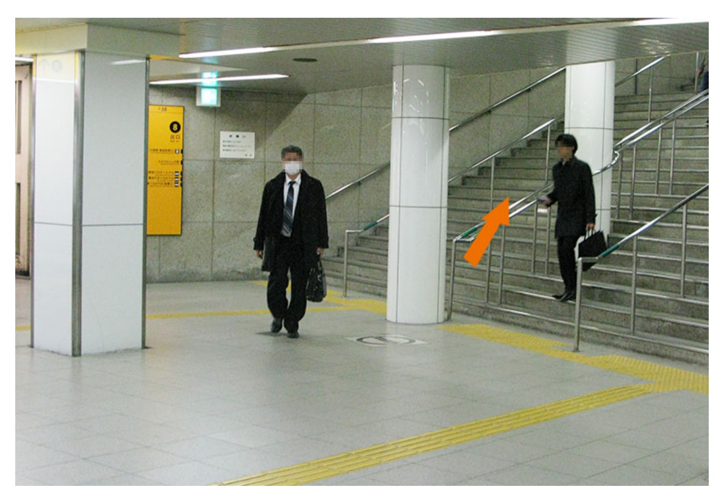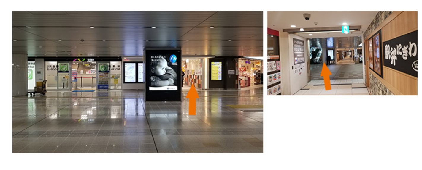 북쪽 개찰구를 나오면 우회전하여 직진하십시오 * 우회전하여 바로 앞의 계단을 내려 가지 마십시오. 계단 뒤쪽의 통로로 향하십시오.