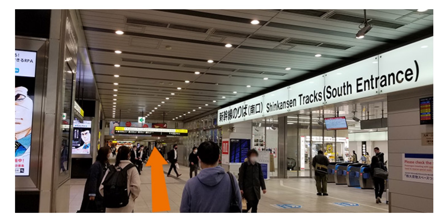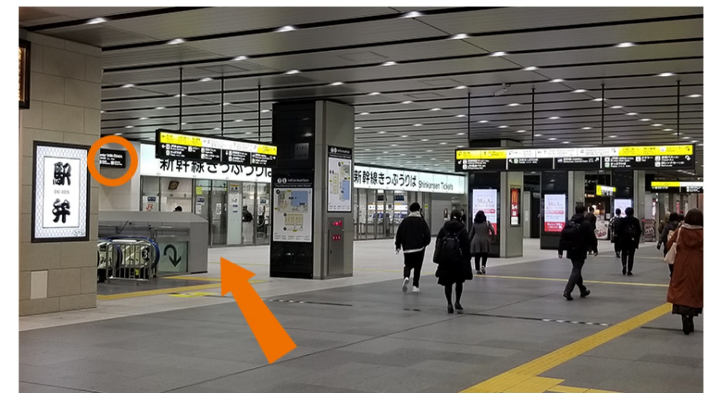 뒤쪽의 에스컬레이터를 타고 올라가 우회전하십시오. (3층, 신칸센 중앙 개찰구로 향)