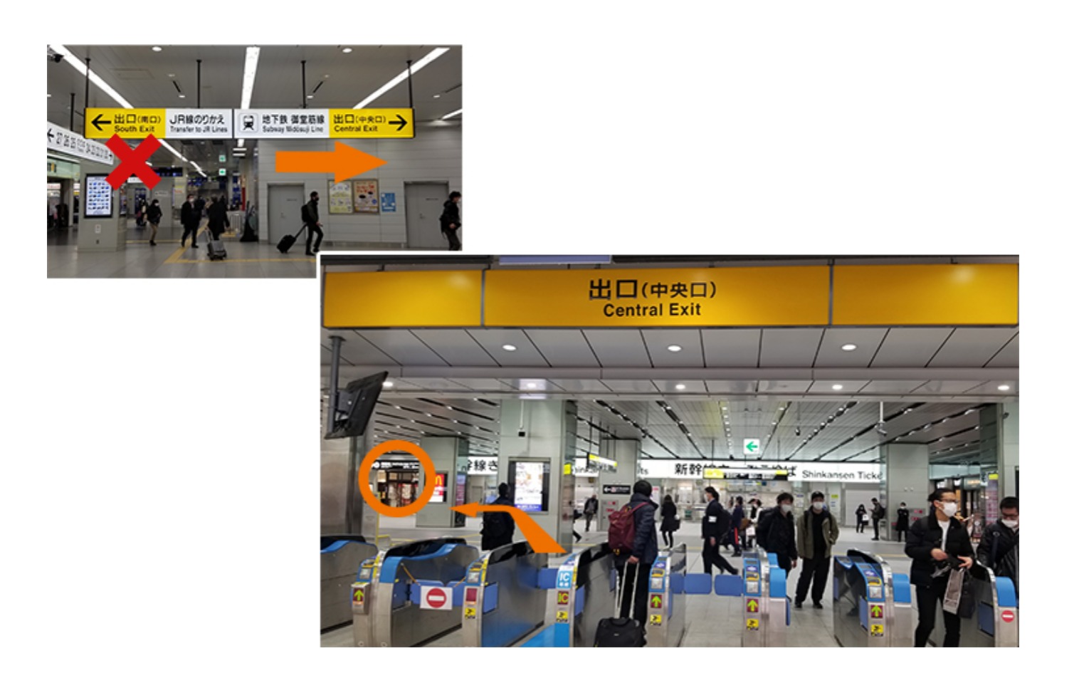 START2층 중앙 개찰구에서 나갑니다. (3층 북쪽 개찰구 또는 2층 남쪽 개찰구에서 나오지 마십시오)