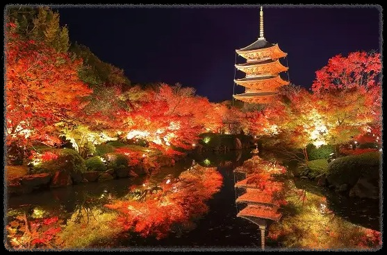 푸른 하늘을 배경으로 우뚝 솟은 오층탑과 화려한 단풍의 대조는 가을의 교토를 대표하는 아름다운 풍경입니다.