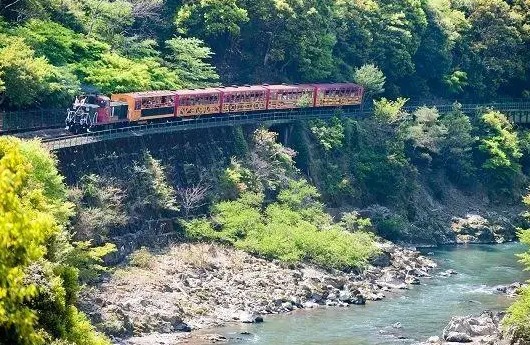 '사가노 토롯코 열차(정식명칭: 사가노 관광 철도)'는 가쓰라 강을 따라 계곡을 올라갑니다. JR 사가아라시야마역 바로 옆에 있는 토롯코 사가 역과 상류의 토롯코 가메오카 역을 연결하는 관광 열차입니다.
