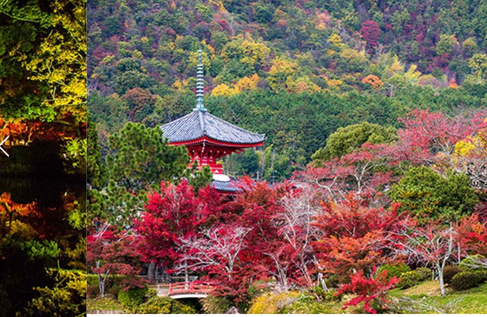 분무 천황의 요청으로 교키 승려가 지은 비샤몬 홀 게이트의 유적. 이곳은 1300년 이상의 역사를 가진 오래된 사원이기도 하며, 지역 주민들에게는 '비샤몬 씨'라는 별명이 붙습니다.사찰 경내에는 많은 단풍이 심어져 있으며 11월 중순에서 하순에 걸쳐 선명한 색으로 변합니다. 유스이 정원의 산책 정원과 비샤몬도 등 볼거리는 많지만, 비샤몬도 문터의 단풍은 광고나 포스터에서 친숙한 흩어져 있는 단풍나무입니다. 황궁으로 이어지는 돌계단이 새빨간 단풍으로 뒤덮이는 모습은 사진을 찍고 싶어지는 환상적인 공간입니다.