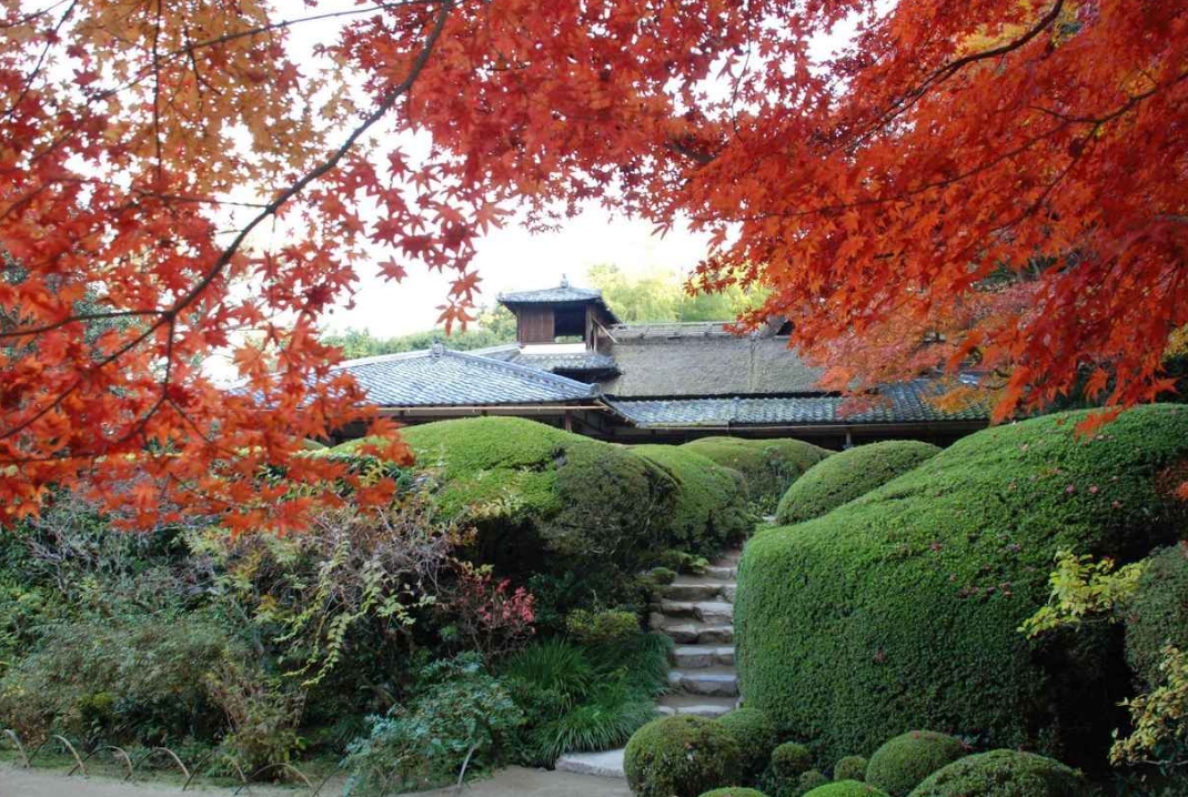 단풍은 많지 않지만, 이곳에서만 감상할 수 있는 세련된 방법이 있습니다. 이것은 크고 작은 쇼인 사원을 회랑으로 연결하는 시온 정원의 단풍을 즐기는 방법입니다.