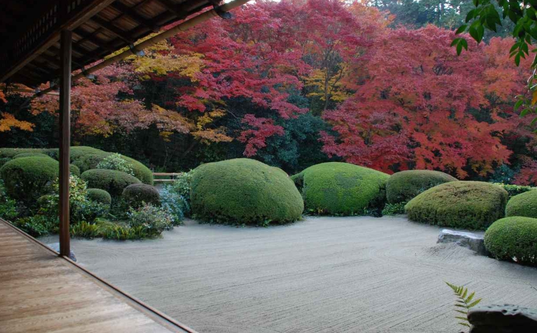 이끼 낀 시오온 정원에는 부처를 상징하는 세 개의 보석이 배치되어 있고, 몇 개의 단풍이 위엄 있게 서서 시시각각 표정을 바꾸고 있습니다. 고쇼인에는 염색 화가 도바 미카가 금형 염색 기법을 사용하여 그린 후스마 그림 '후나데'가 있고, 정원의 다이쇼인 쪽에서 고쇼인을 바라보면 단풍과 '후나데'가 겹쳐져 독특한 아름다움을 연출하는 것을 볼 수 있습니다.
