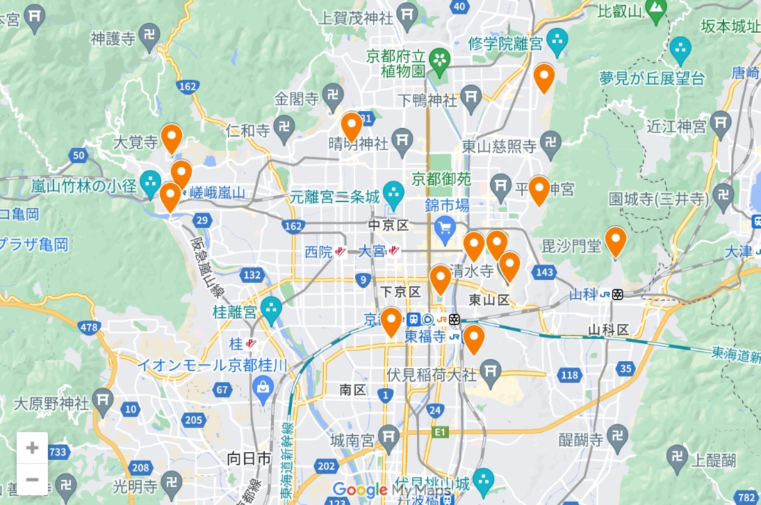 | 도후쿠지(東福寺) 주소 : 15-778 교토부 교토시 히가시야마구 혼마치 전화 : 075-561-0087 입장 시간 : 4월 1일~10월 31일 9:00~16:30(16:00까지) 4월 1일-10월 31일: 9:00-16:30 (입장 마감 16:00) 11월1일~12월1일 8:30~16:30(16:00까지) 12월 2일~3월31일 9:00~15:30(접수마감 15:30) 입장료 : 츠텐바시・카이잔도 600엔(11월 9일~12월 1일은 1,000엔) 츠텐쿄 & 카이산도 홀: 600엔(11월 9일부터 12월 1일까지 1,000엔) 혼보 가든 500엔 공통 입장권 1,000엔(11월 9일~12월 8일 제외) 접근 : JR 게이한 '도후쿠지역' 하차 도보 약 10분, 게이한 '도바 카이도역' 하차 도보 약 8분 웹 : 도후쿠지 공식 사이트 단풍을 볼 수 있는 절정 시기의 예보 : 11월 중순~12월 상순 라이트 업 : 11월 16일(토) ~ 12월 1일(일) 17:30~19:30 (접수는 19:00까지) |