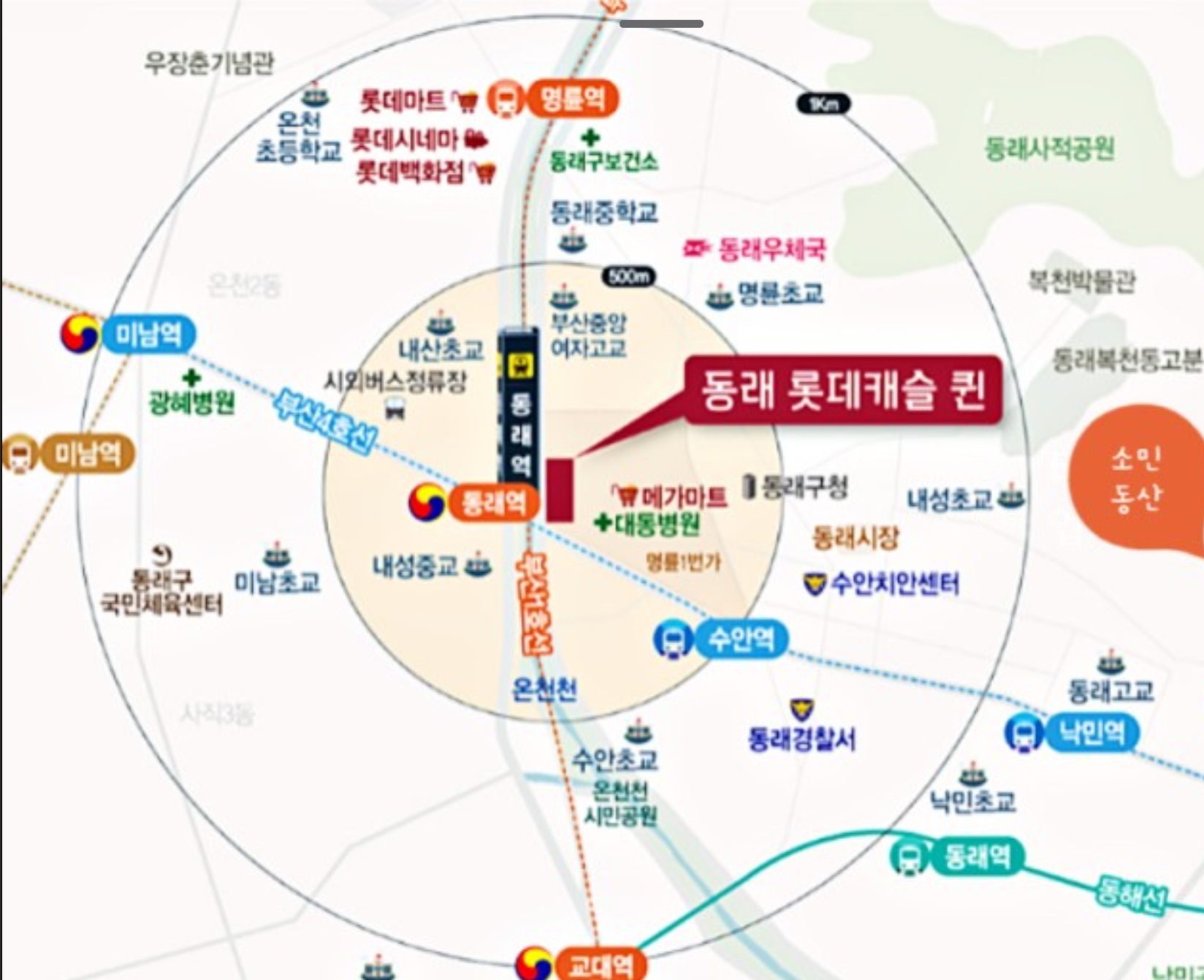 3. 생활 인프라: 대형 마트, 쇼핑몰, 음식점 등 다양한 생활 편의 시설이 가까워 일상 생활이 편리합니다. 동래구청, 병원 등 공공기관 및 의료시설도 인근에 있어 편리합니다.