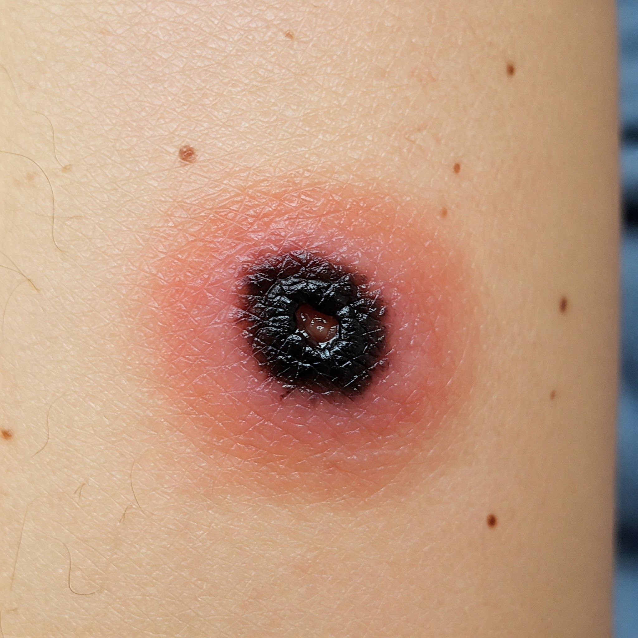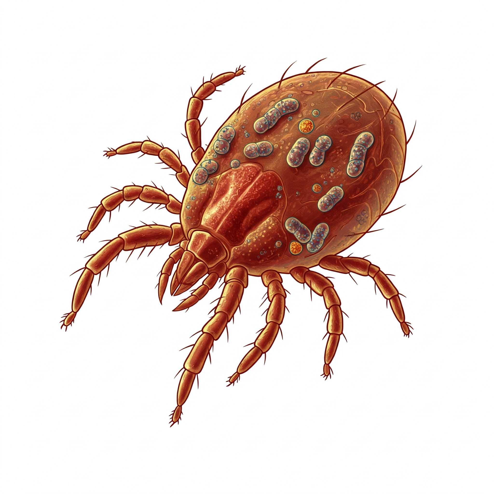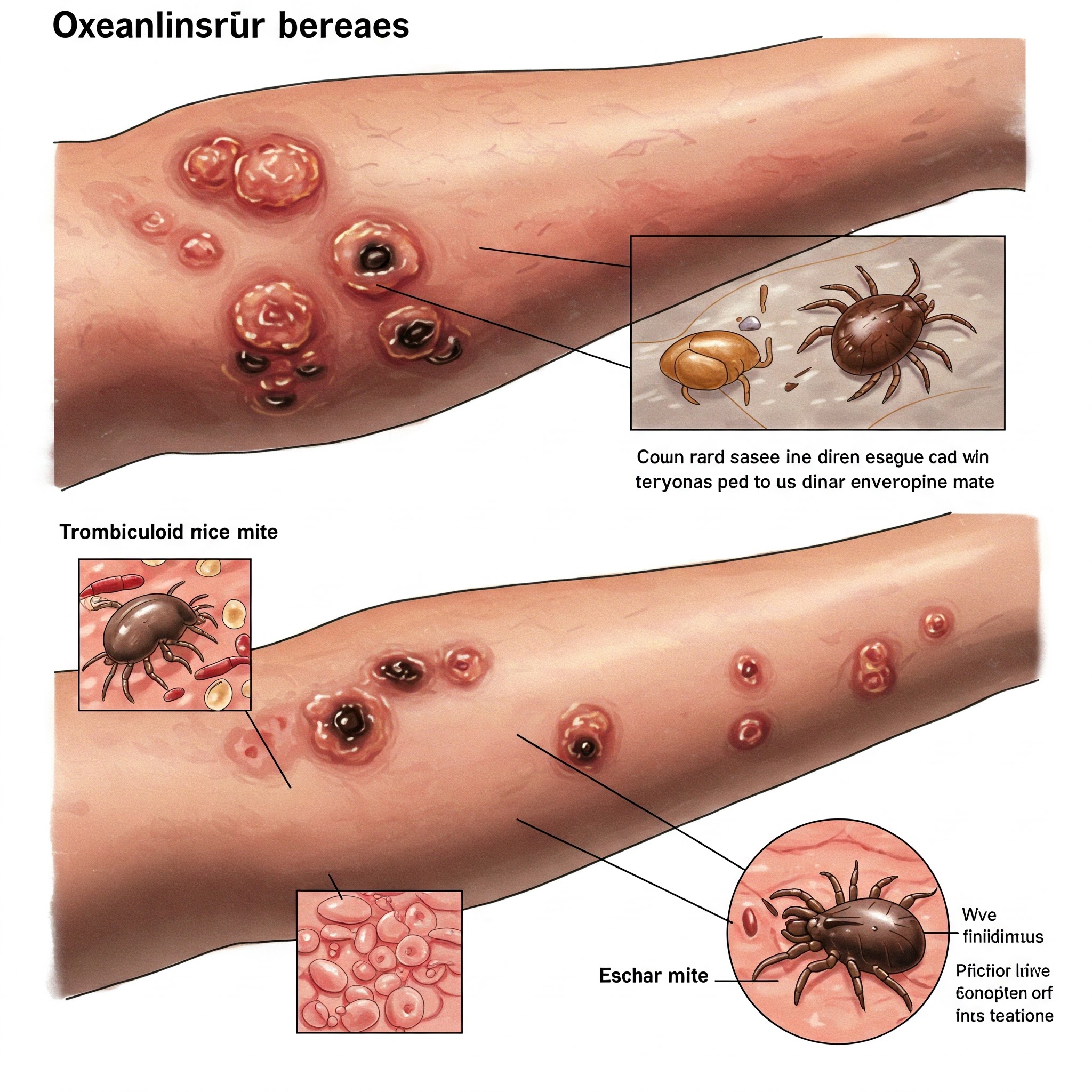 * 가피(Eschar): 털진드기 유충에 물린 부위에 특징적인 검은 딱지(가피)가 형성됩니다. 크기는 5~20mm 정도이며, 주로 겨드랑이, 사타구니, 엉덩이 등 잘 보이지 않는 습한 부위에 생길 수 있습니다. 가피는 쯔쯔가무시병 진단에 매우 중요한 소견입니다.
