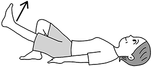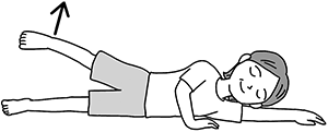 외전근운동에서는 근육운동을 하지 않는 쪽의 다리를 아래쪽으로 하고 옆으로 향하여 무릎을 구부린 상태에서 균형을 잡습니다.근육 운동을 하는 편의 위쪽 다리의 발 뒤꿈치를 10cm정도 띄우고 5~10초간 가만히 합니다.이를 20회 반복합니다(그림 2).