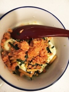 불을 멈추고 그릇에 담고 시판하고 있는 오차즈케의 재료를 넣으면 완성입니다.