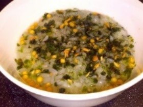 콩나물 뿌리 끝을 제거한 콩나물을 삶아, 물을 뺀 후 밥알 정도의 크기가 될 때까지 잘게 썰어 그릇에 담고 시판 중인 차에 절인 재료와 뜨거운 물을 뿌려서 완성입니다.