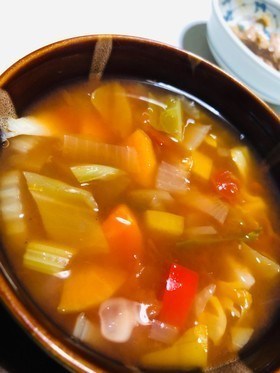 양파, 당근, 샐러리, 양배추, 파프리카를 잘라 냄비에 넣고 다시 깡통콩, 토마토캔, 물, 소금, 후추를 넣고 끓이면 완성입니다.