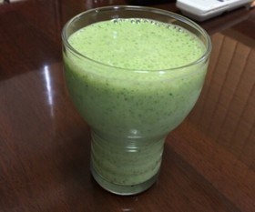 소송채, 바나나, 사과 주스, 두유를 믹서에 넣고 교반하여 잘 섞이면 완성입니다.